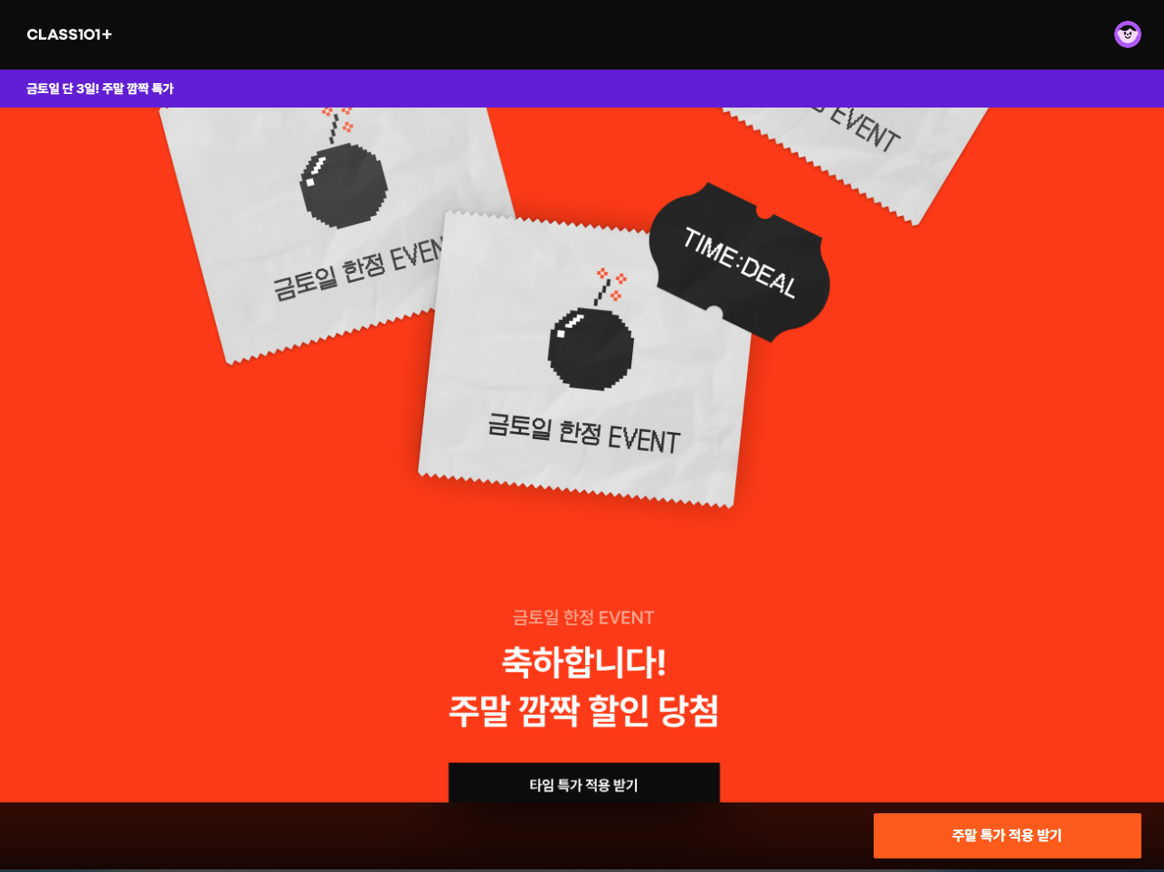 클래스101 홈페이지에 가입하고, 어느 정도 체류하면서 이것저것 클릭하다 보면 깜짝 할인 혜택 팝업창이 나오게 됩니다.(3~5분 정도 했던 것 같습니다)
